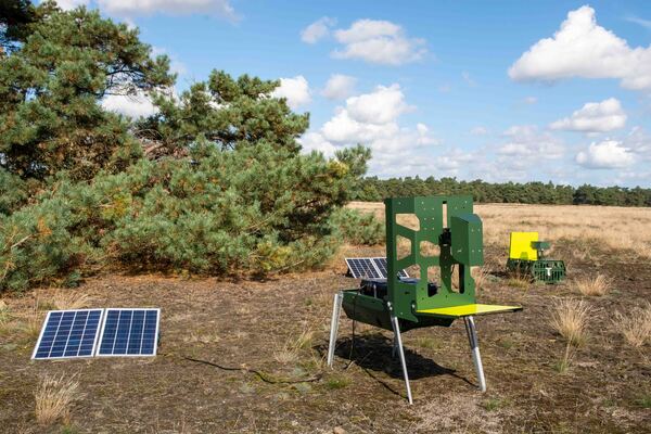 Op een zonnige septembermiddag vergezelde ik Theo Zeegers, projectleider bij EIS Kenniscentrum Insecten, bij het ophalen van de twee camera’s op het Otterlose Zand. Ze zijn hier geplaatst dankzij bijdragen van de provincie Gelderland en onderdeel van een toekomstig hoogwaardig landelijk netwerk voor het monitoren van trends in aantallen en biomassa van vliegende insecten. De keuze voor het Otterlose Zand heeft alles te maken met de proef waarover ik in de nieuwsbrief van mei 2020 vertelde. Tapuit-specialist Herman van Oosten plaatst hier namelijk sedert 2020 enkele broedkasten voor de insectenetende en sterk bedreigde tapuit.