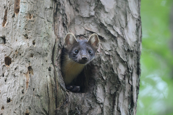 In Het Nationale Park De Hoge Veluwe is een aantal plekken waar boommarters zitten. Maar het is lastig om ze te spotten, want ze laten zich zelden zien. De Faunawerkgroep van het Park zoekt elk jaar naar sporen van het dier, zoals uitwerpselen, afgebeten vogelveren, prooiresten en haren rond gaten in bomen. In 2024 vond de werkgroep op verschillende plekken sporen, en een enkele jonge marter. Hierover kun je meer lezen in het Faunajaarverslag 2024.