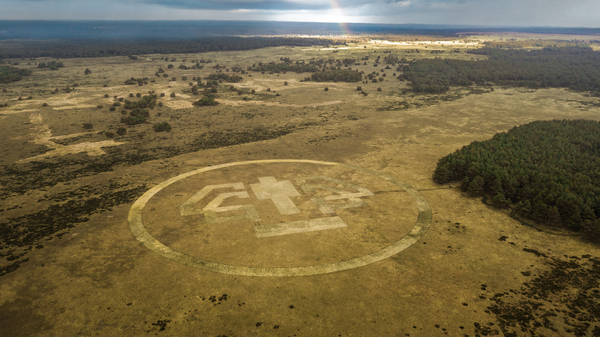 40% van het stuifzand op de hele Veluwe ligt in Het Nationale Park De Hoge Veluwe. Door het cumulatieve effect van stikstofdepositie worden de stuifzandlandschappen op De Hoge Veluwe nog steeds sterk bedreigd, daarom zijn er wederom werkzaamheden gestart. Bij één van deze projecten op het Oud-Reemsterzand is dit keer niet gekozen voor plaggen, waarbij de aanwezige mineralen worden afgevoerd. Rekening houdend met de ecologische voorwaarden, is de toplaag zodanig omgewerkt dat het blonde mineraalrijkere zand aan de oppervlakte is gekomen. De bewerkte stroken beschrijven het logo van Het Nationale Park De Hoge Veluwe.